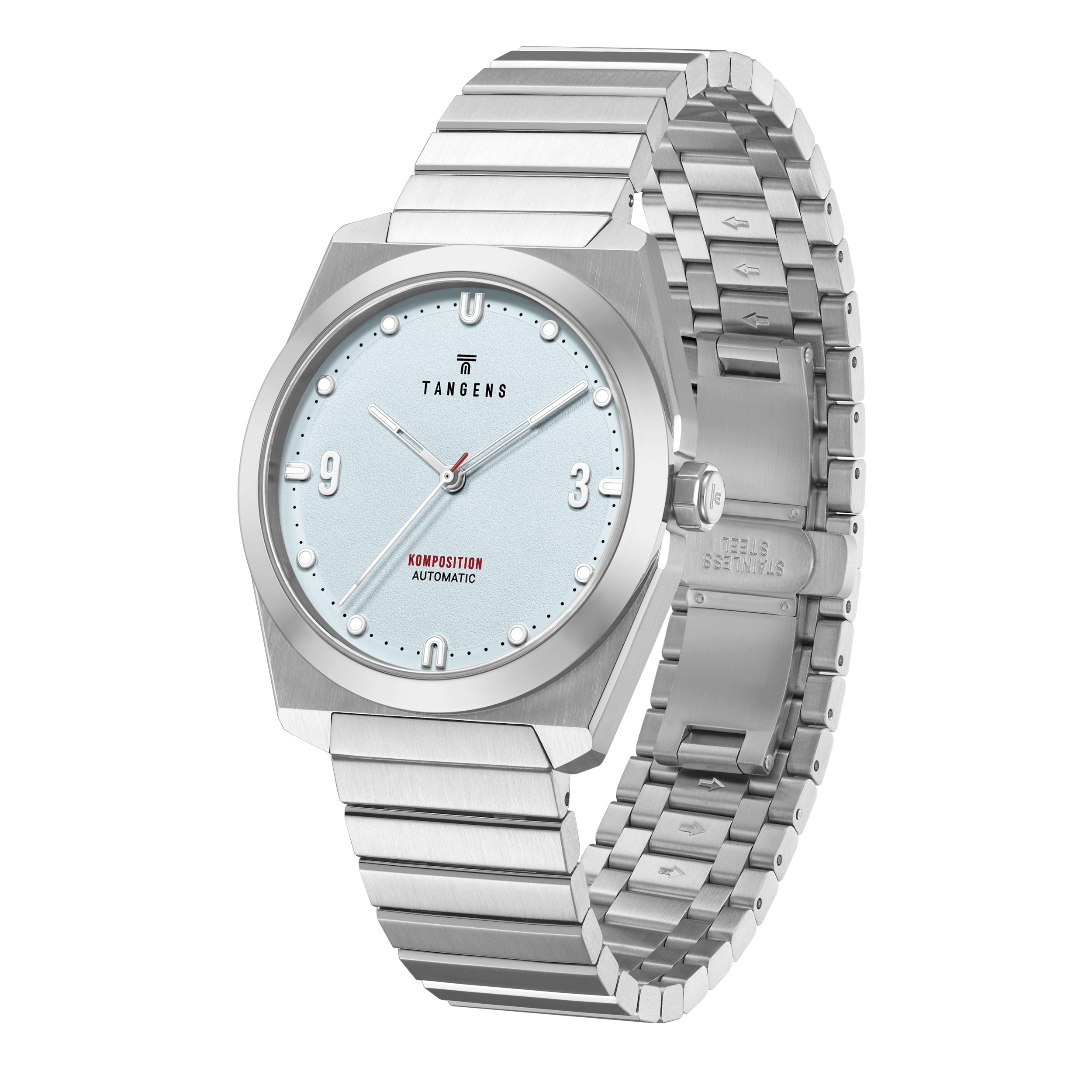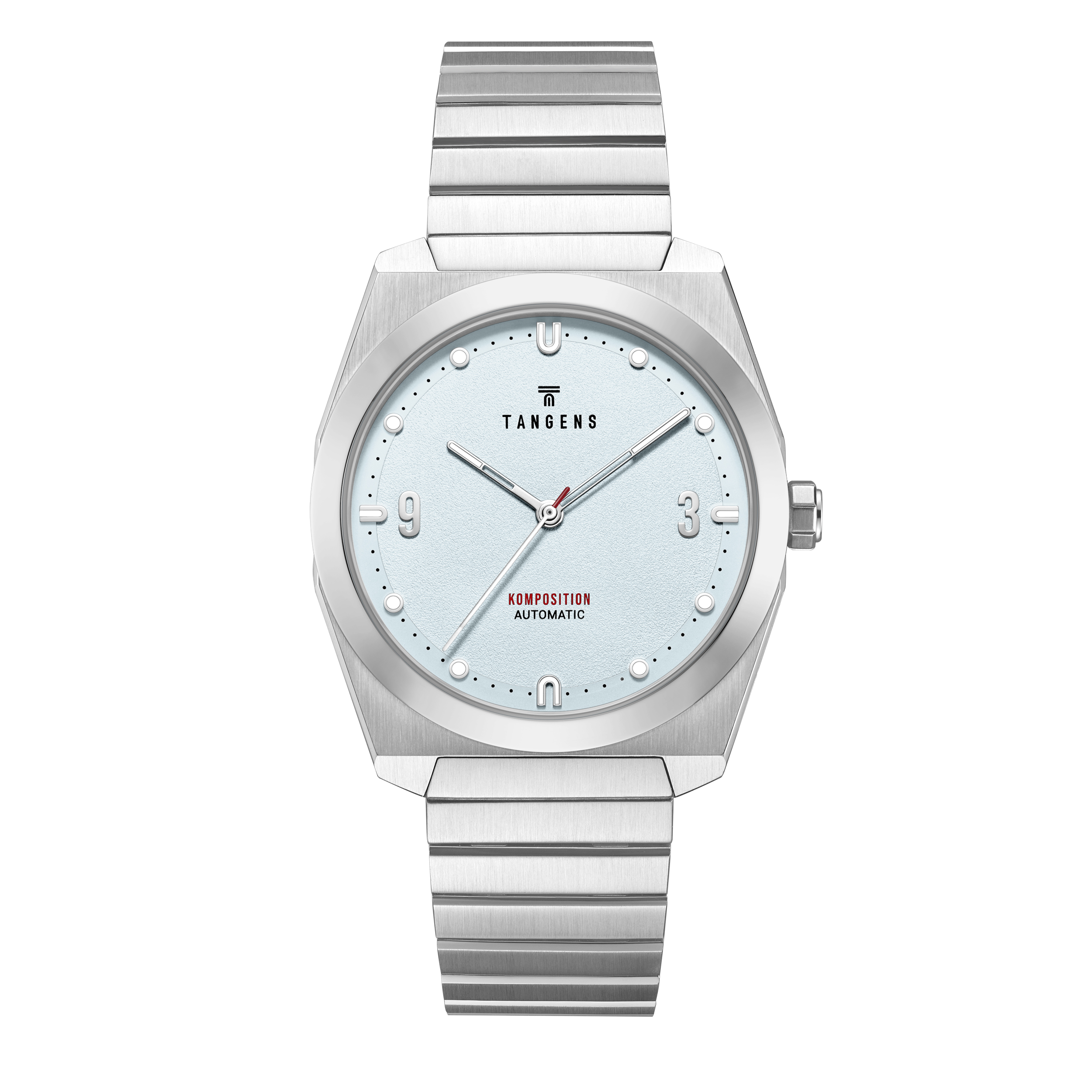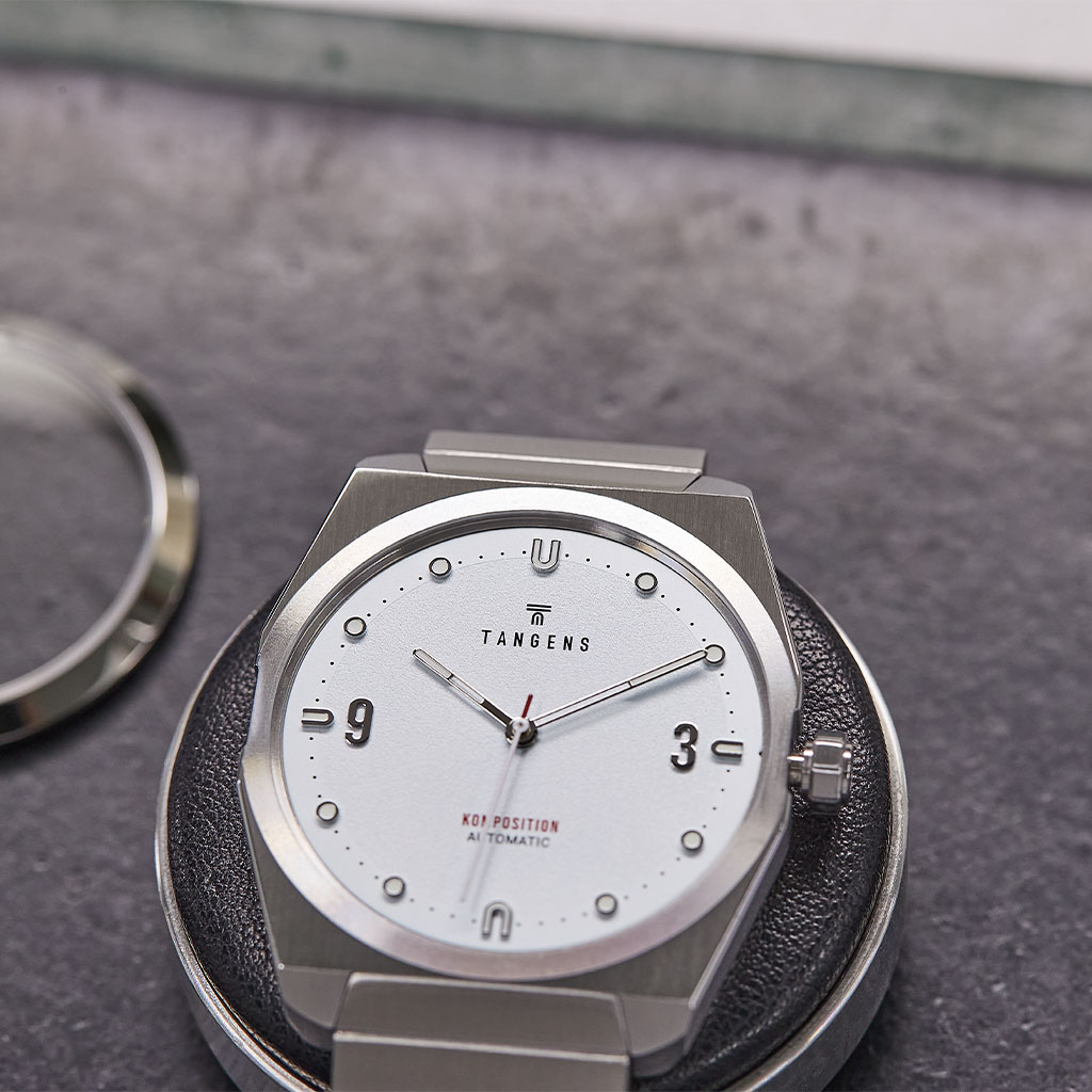 Komposition Automatic combines 70s-inspired undertones with modern proportions in a retro-fixed design language. The watch case is 38 mm in size to fit mosts wrists elegantly. Pronounced geometric angles reflect the light beautifully, while the simple steel bracelet, with similar angles as the watch case, gives a harmonious expression. The dial is minimalist with branded elements that are present without shouting loudly.